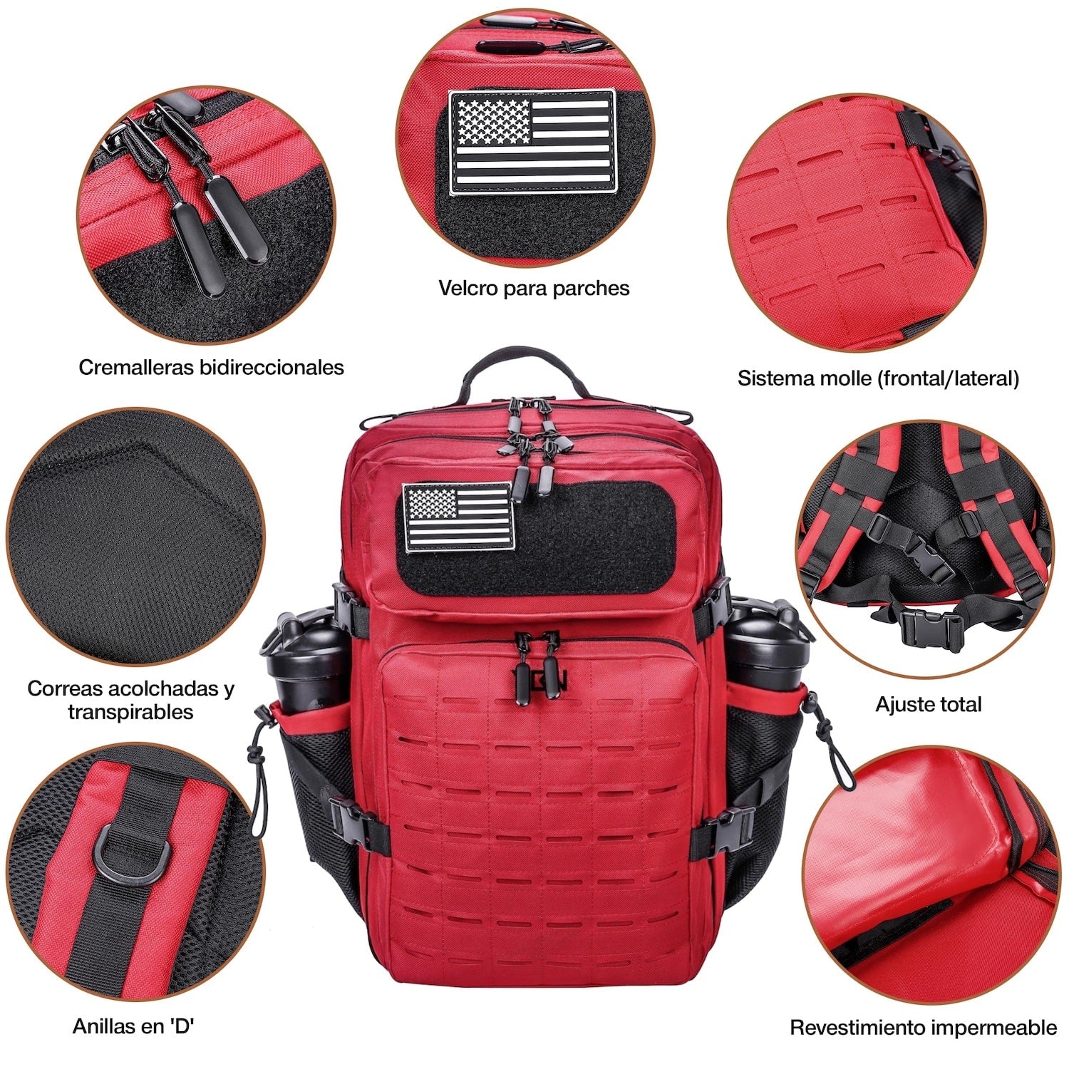 - Bolsillos laterales para botellas de agua